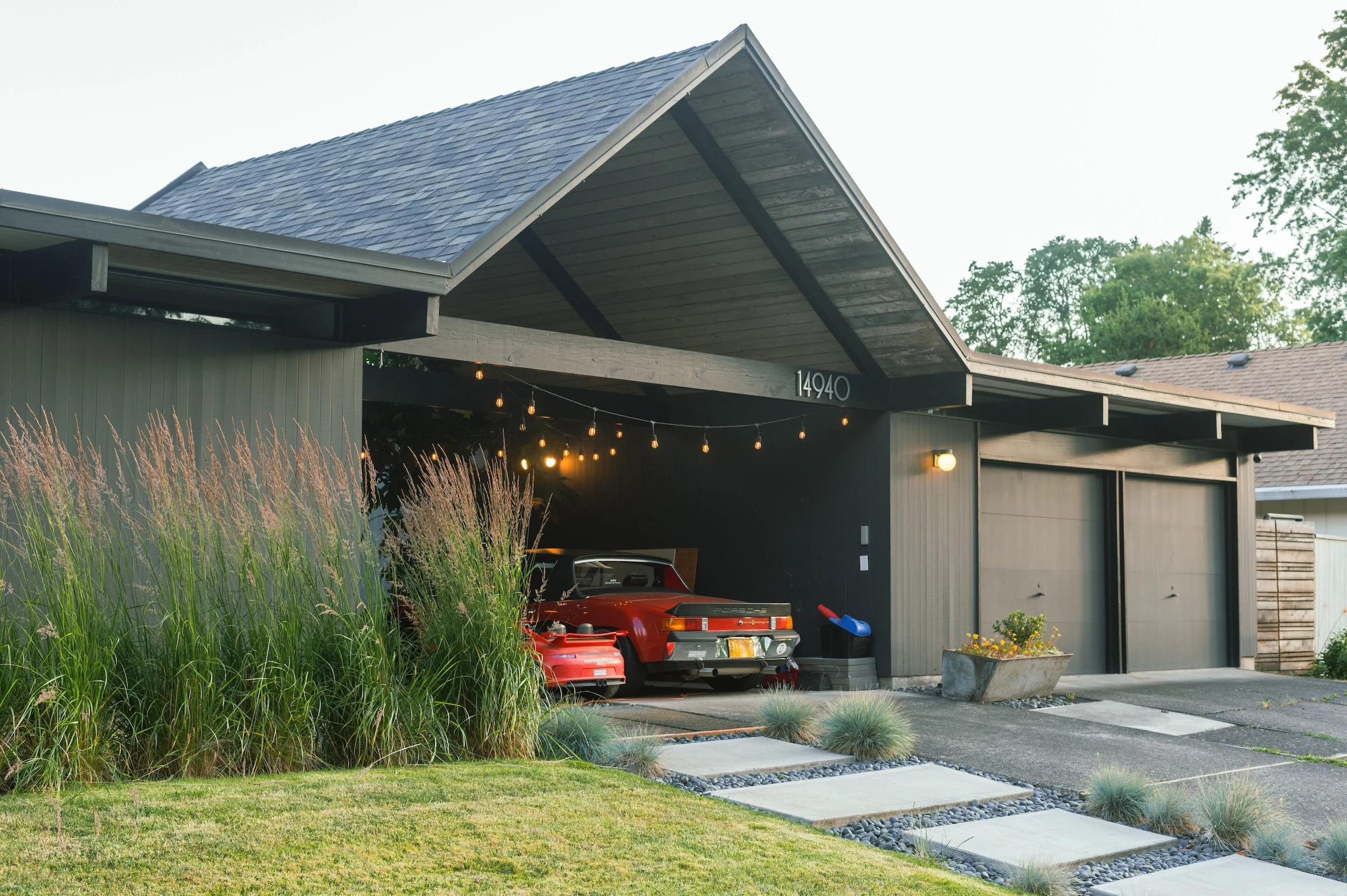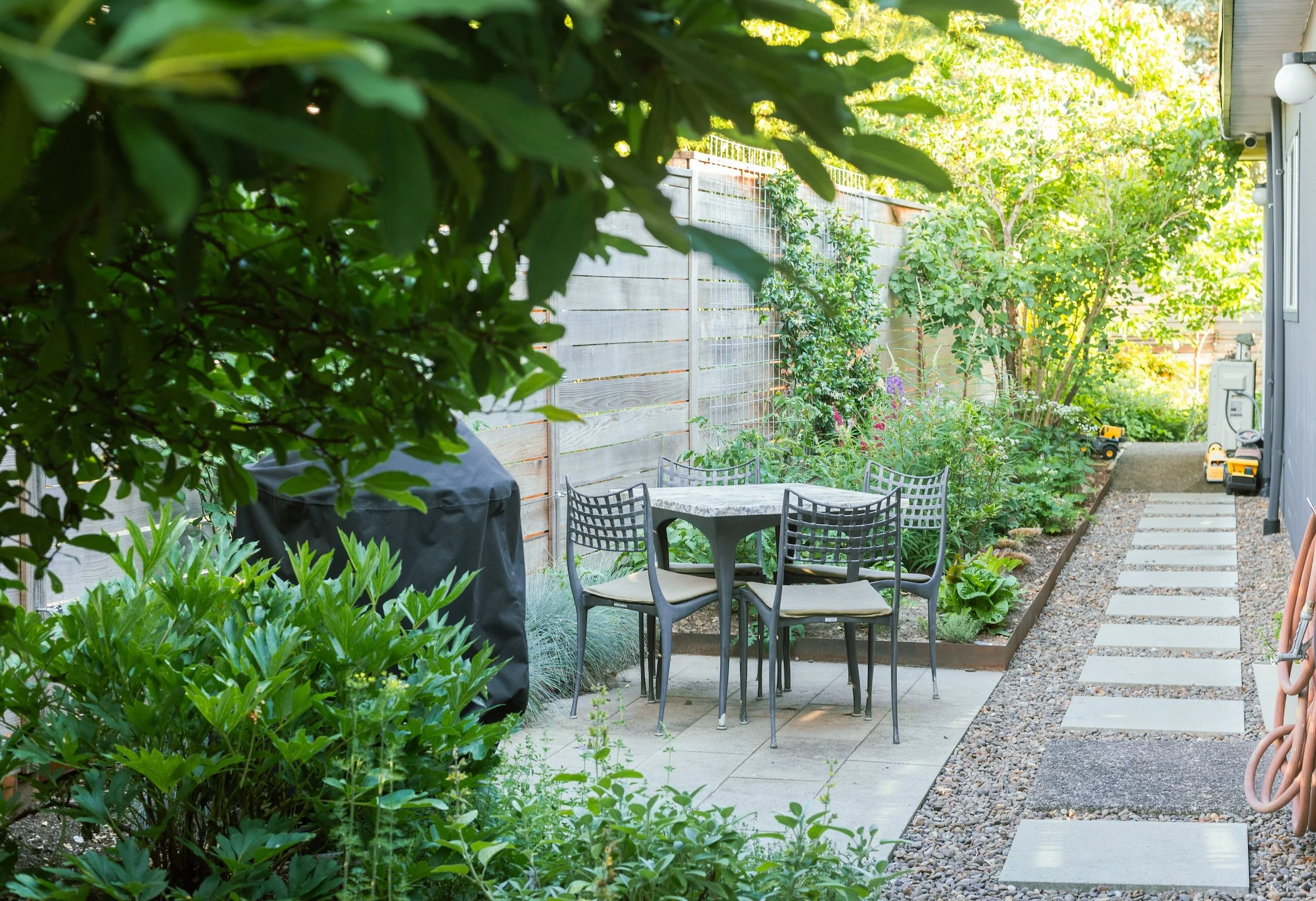 A series of outdoor “rooms” make the most of the narrow garden space surrounding this Mid-Century home by incorporating discrete living areas into a lush, modern landscape.