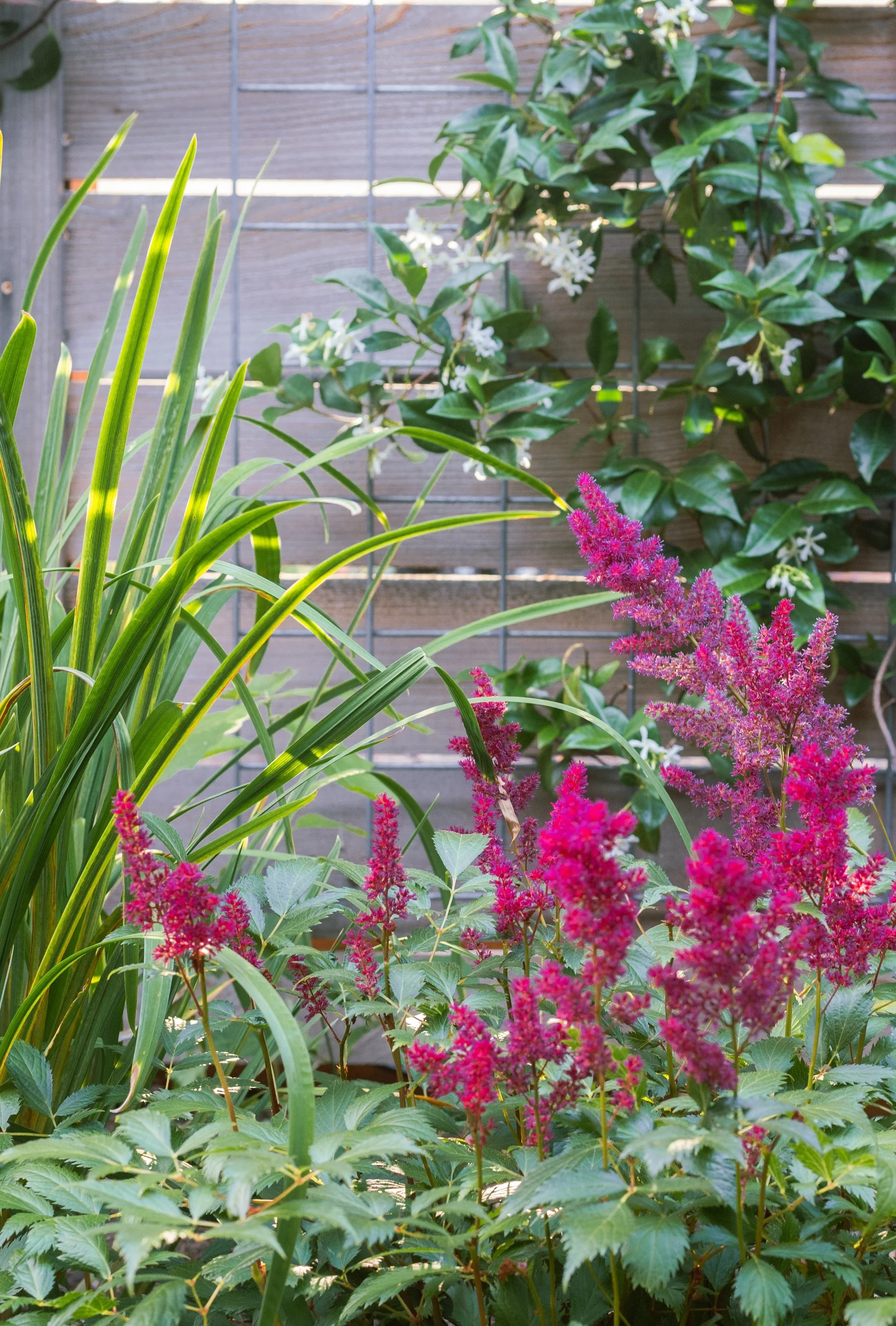 Areas for lounging, dining, playing and soaking weave into this flower-filled landscape. Trellising added to almost every fence supports climbing roses, clematis and jasmine. It won’t be long until this garden is surrounded by lush greenery and the sweet scents of summer.