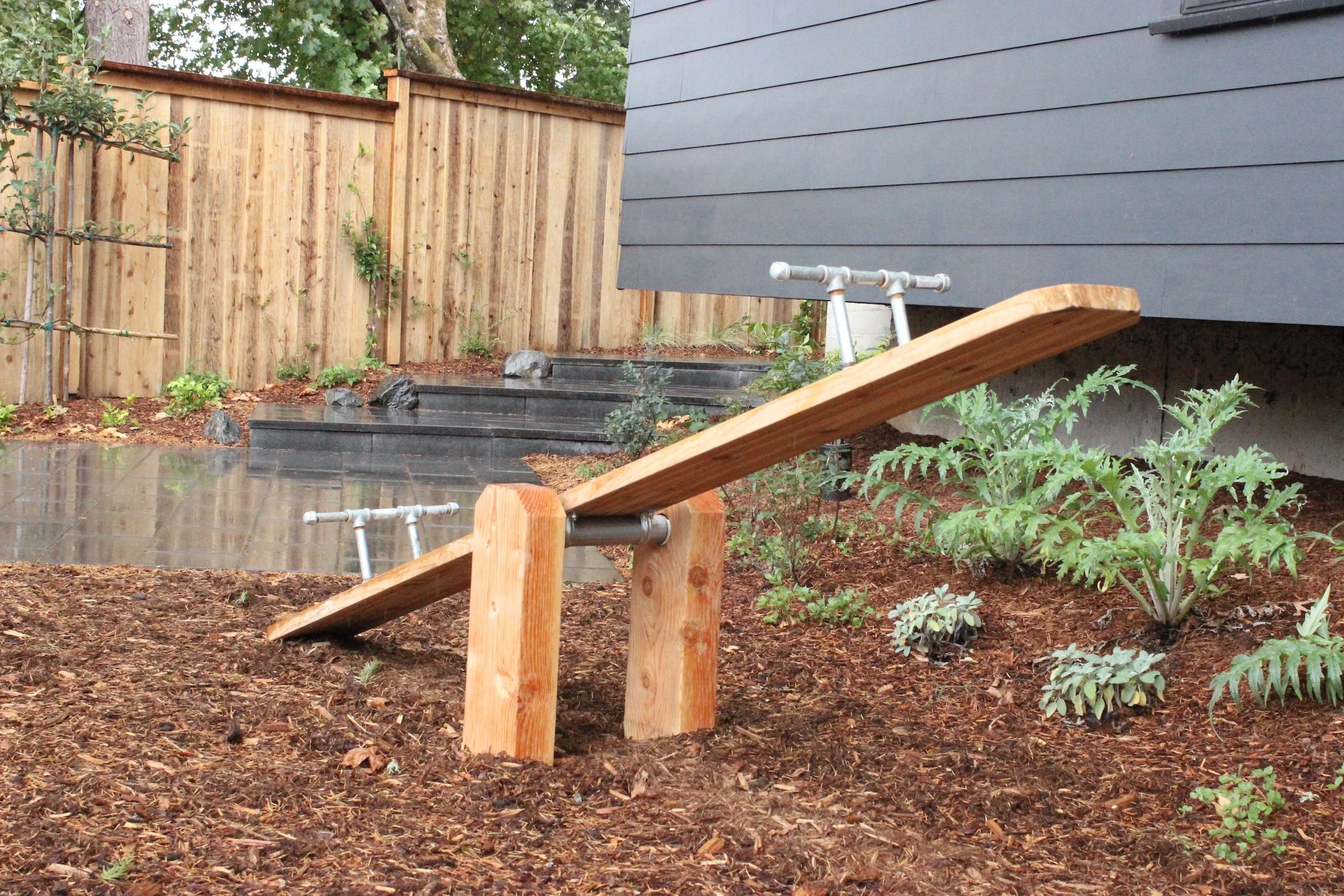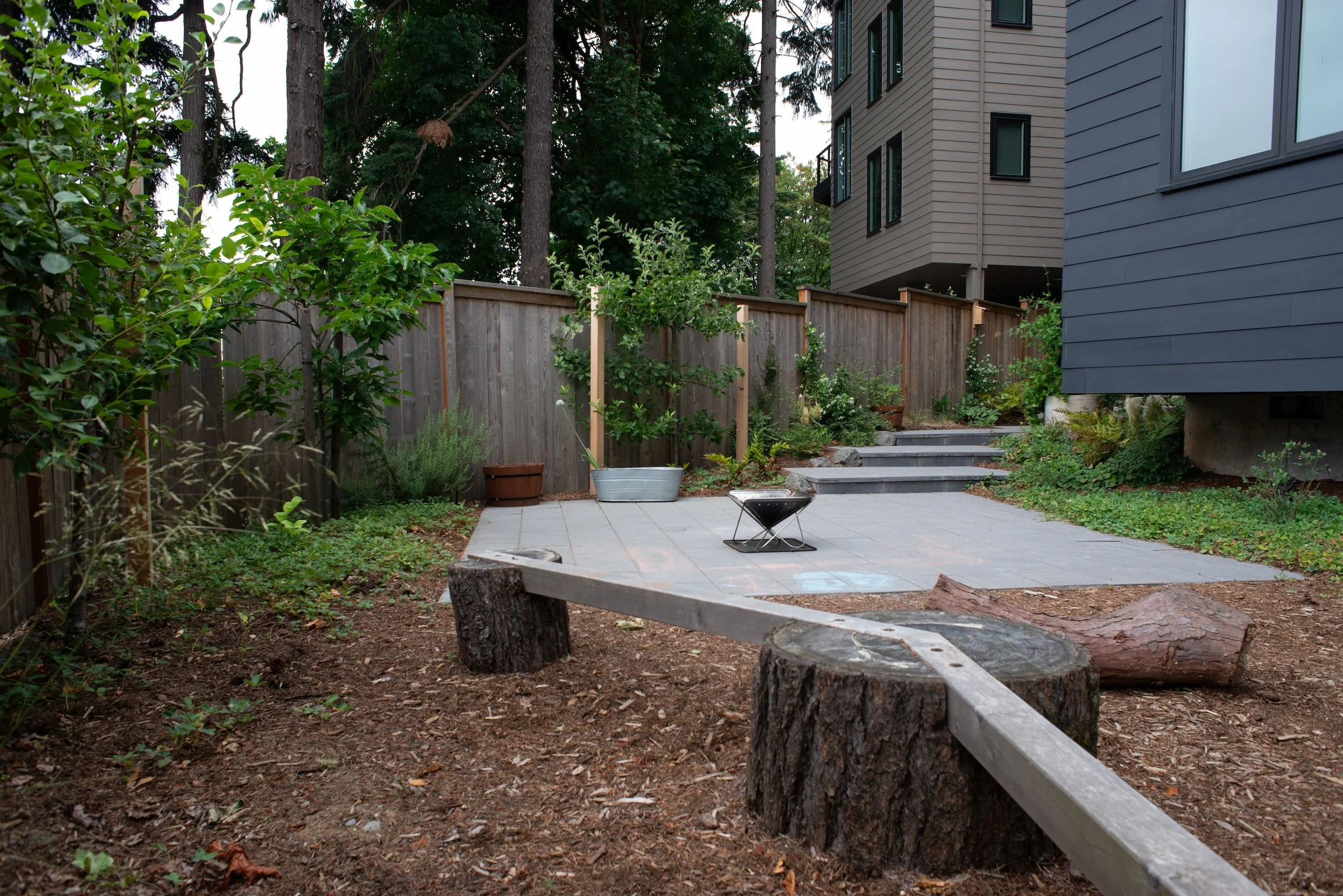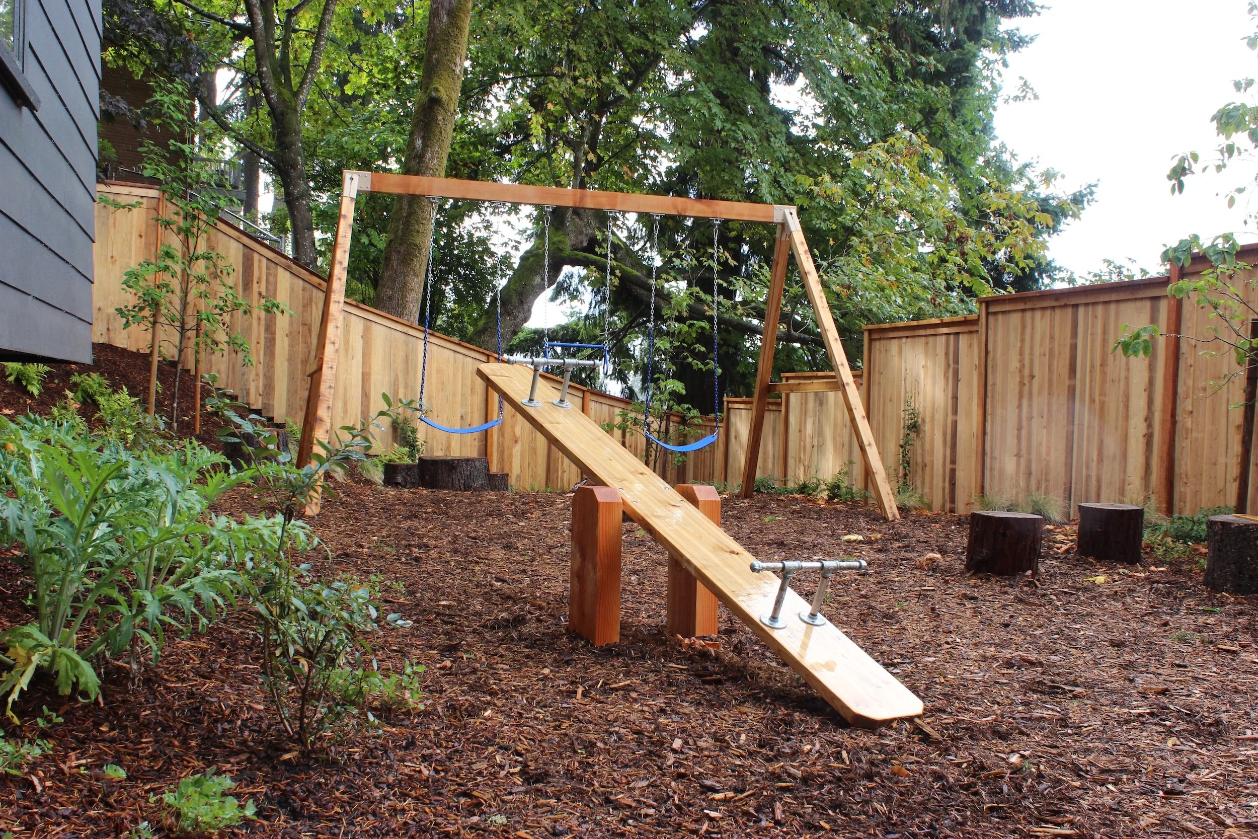 Built into the west slope of Mt. Tabor, this home’s steep site provided an opportunity to create a natural playscape and food forest for this family with young children.