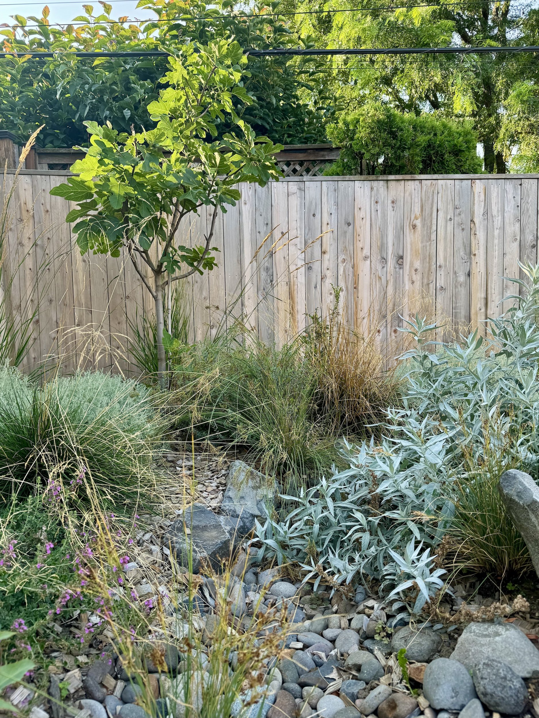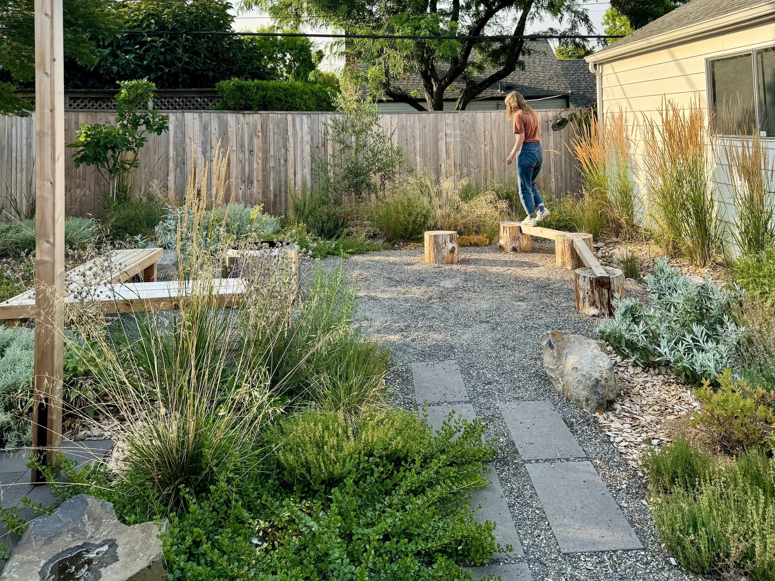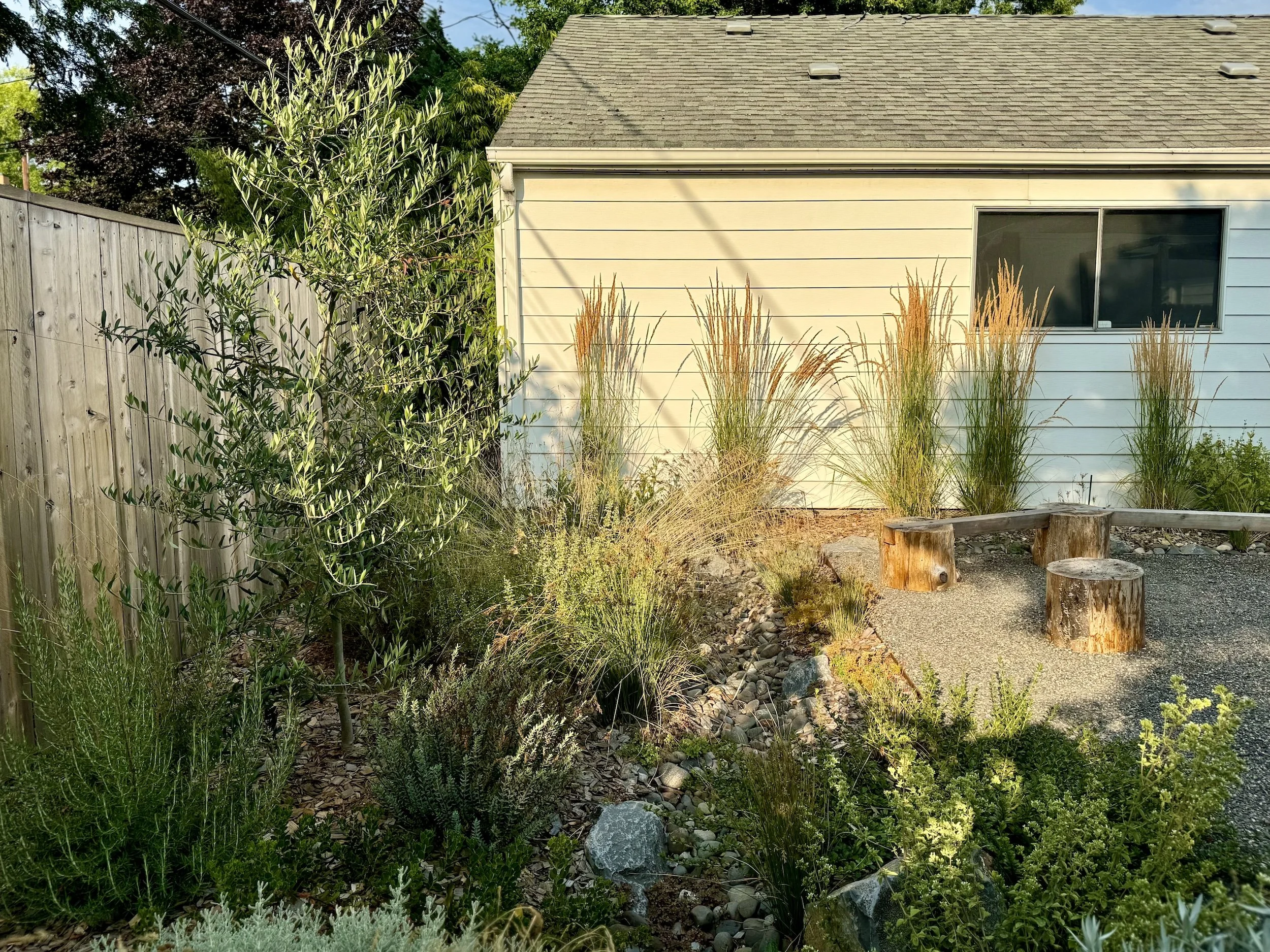 A rainwater swale wraps around patios and play areas for this young family in North Portland. Filled with Mediterranean and West Coast natives, this garden comes to life even in the dry season.