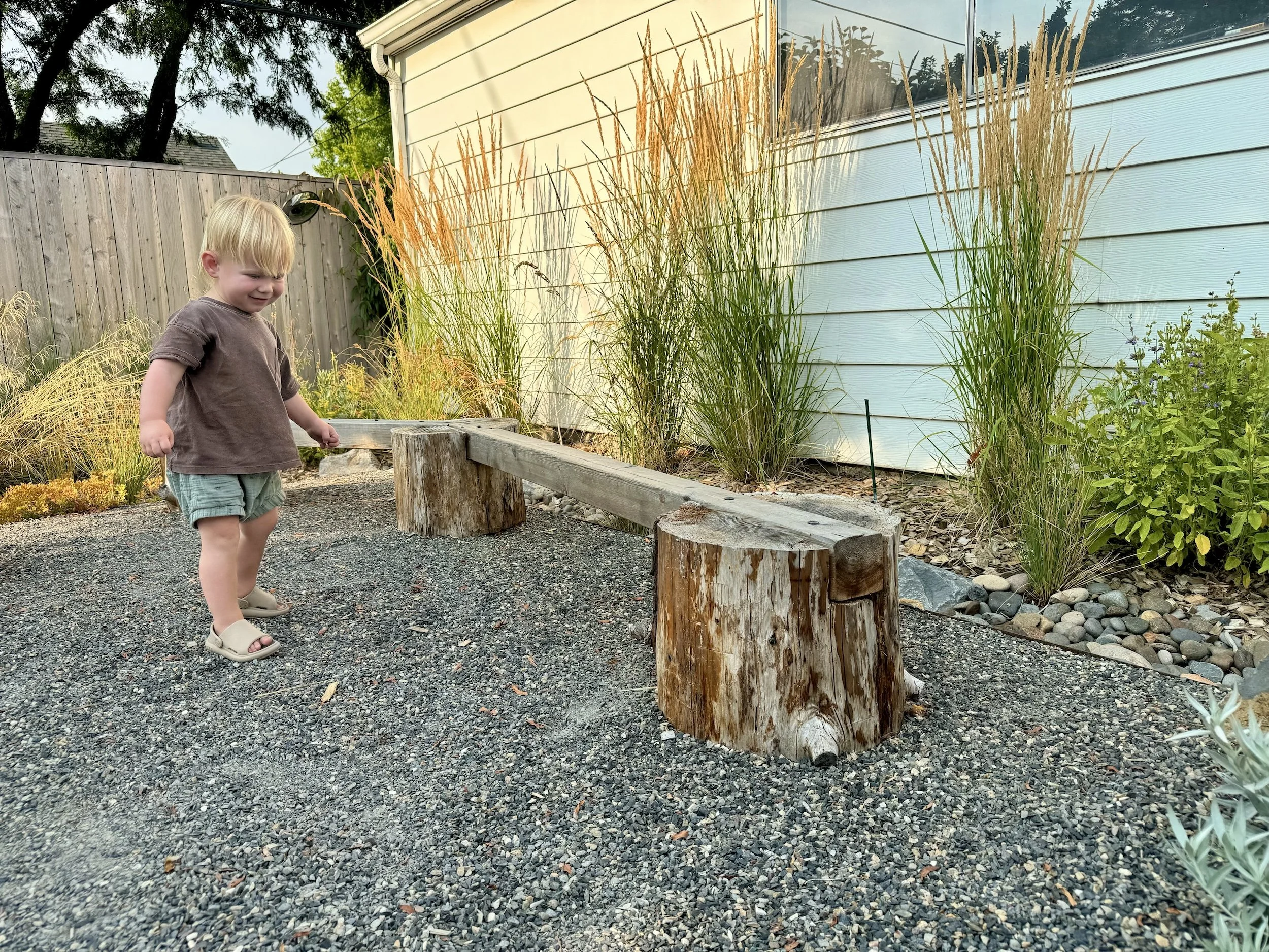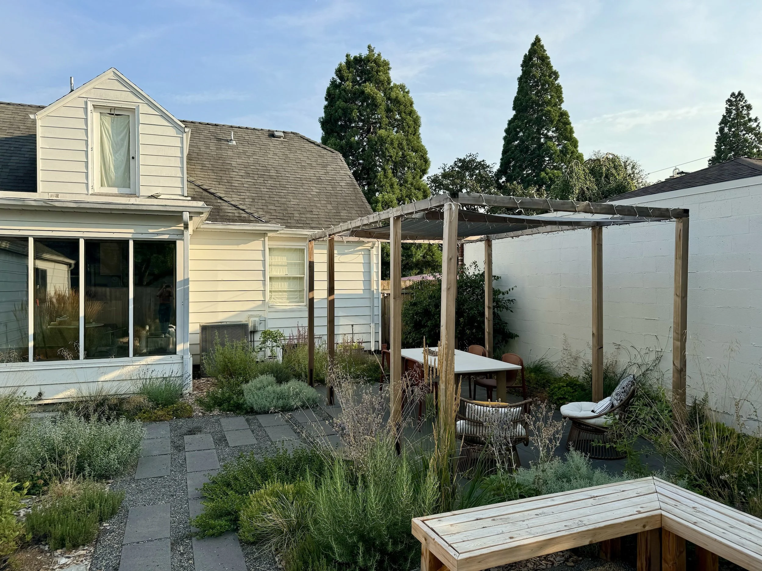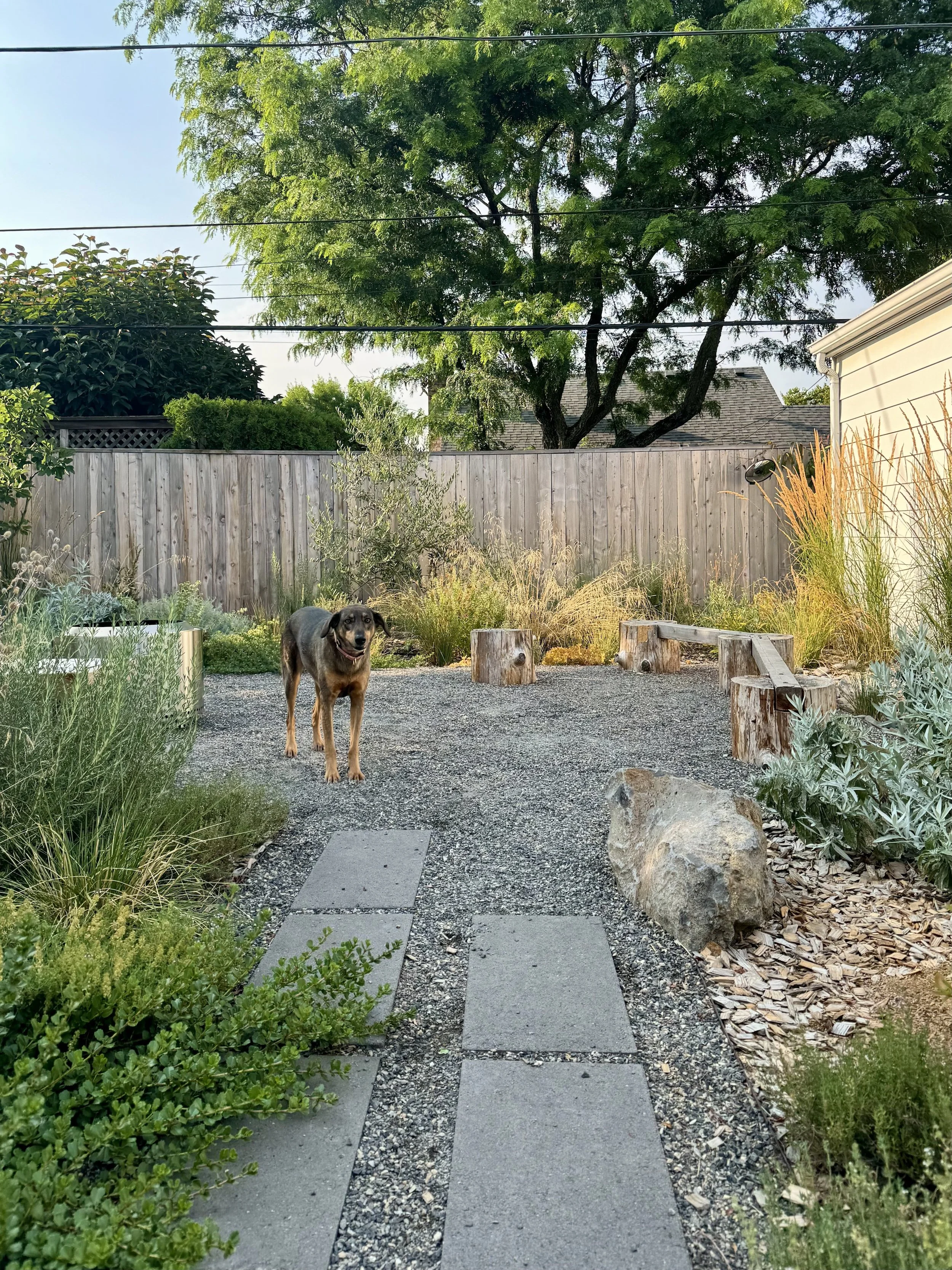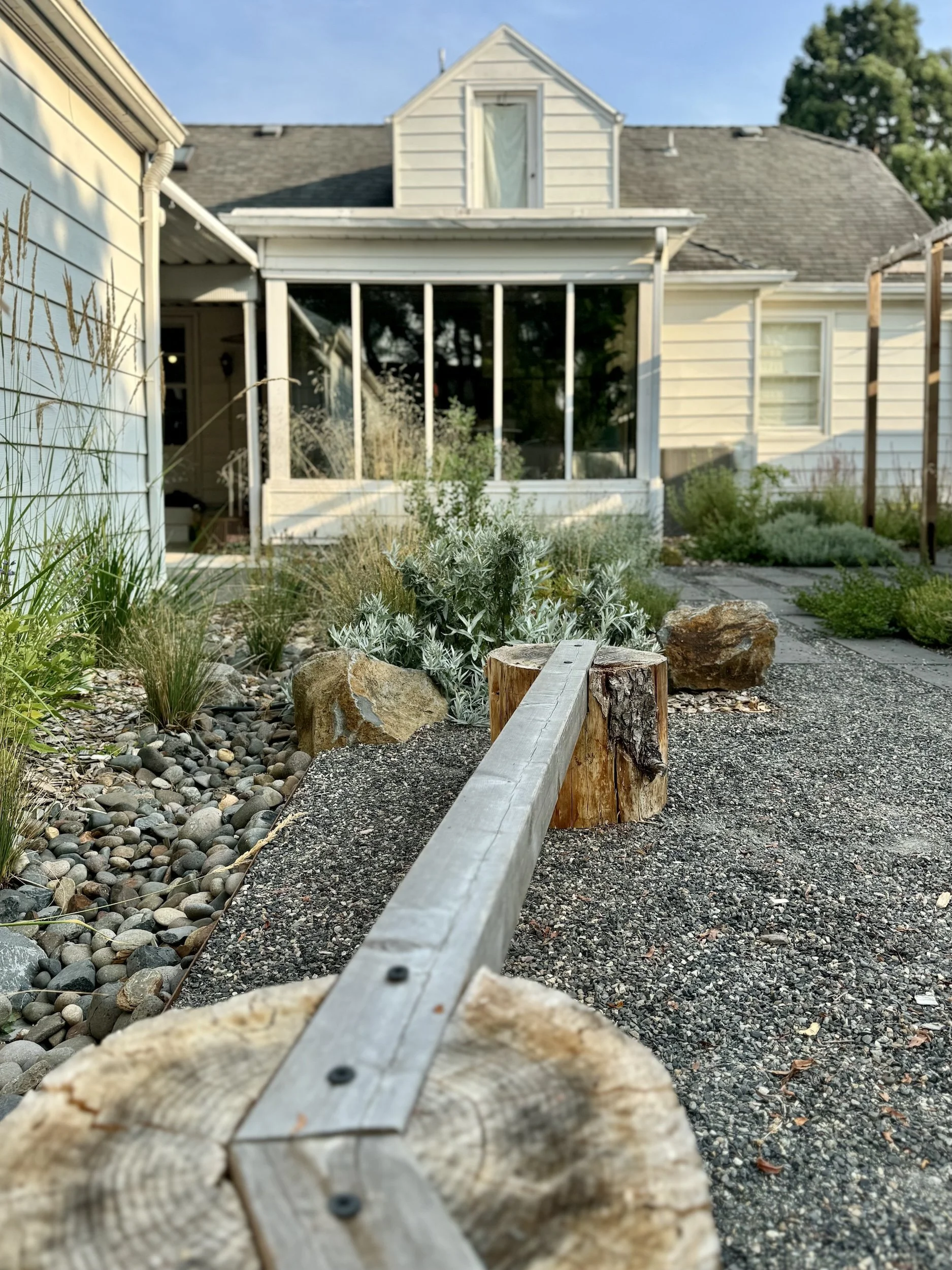 A rainwater swale wraps around patios and play areas for this young family in North Portland. Filled with Mediterranean and West Coast natives, this garden comes to life even in the dry season.
